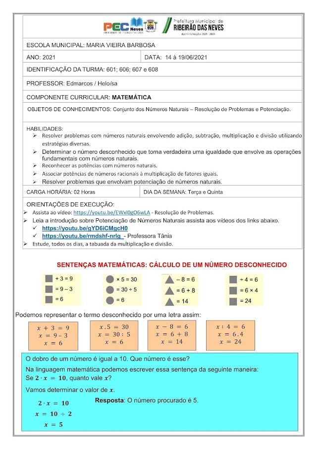 Atividades de Matemática - 6° Ano - 07 a 11/06/2021